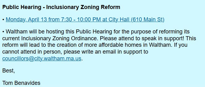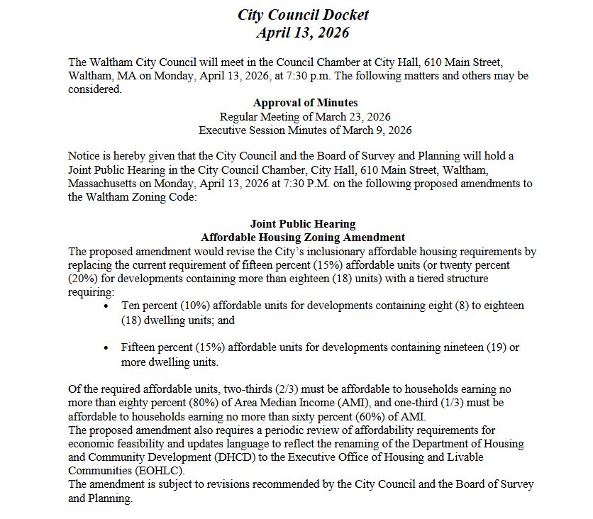 In an e-mail to supporters, Waltham Inclusive Housing’s (WIN) Tom Benavides said that tonight is a “*huge* opportunity to bring more affordable housing to Waltham” as “city council will be holding a public hearing [at 7:30 PM] to adopt a new Inclusionary Zoning Ordinance that makes affordable home creation economically feasible.”