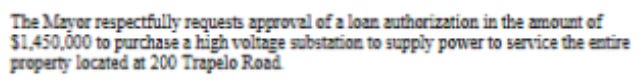 The mayor is requesting the Council to approve a 1.45 Million dollar loan “to purchase a high voltage substation to supply power to service the entire property located at 200 Trapelo Road.”
